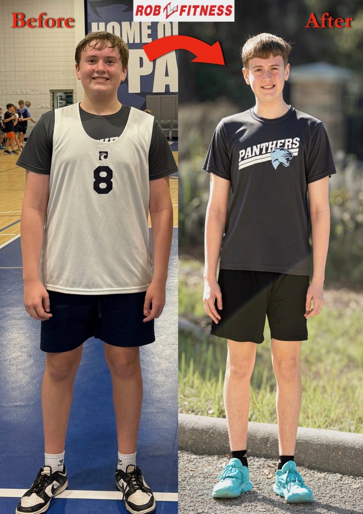 November 2025 is when I first started at Rob and committed to 12 sessions up front. Having scheduled pre-workout times helped me stay on track for my home workouts I did in between RobZ sessions. I started using a fitness watch to track my heart rate and calories burned to help me stay motivated and workout longer. RobZ advice to never skip breakfast and make sure I consumed enough protein in a day made all the difference. I went from hardly ever eating breakfast to always drinking a protein smoothie in the morning. Instead of peanut butter and jelly sandwiches, I switched to chicken in my lunches for school. I also cut down on mindless snacking and sweets. I even turned down cake on my birthday!